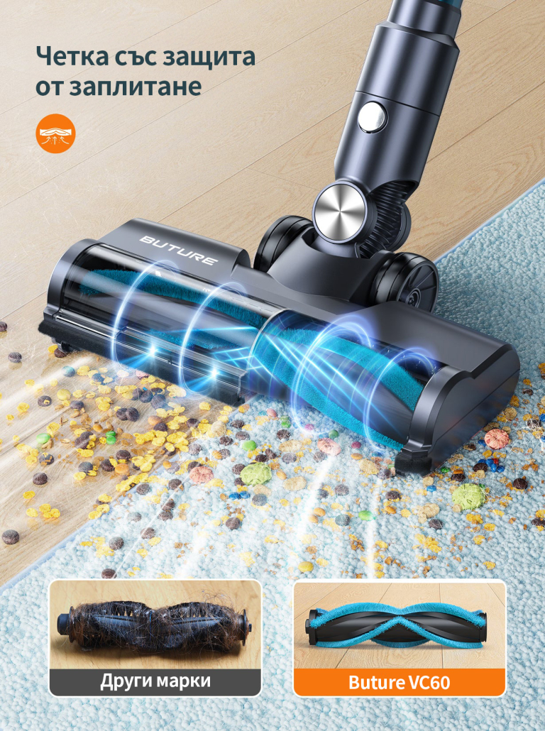 С високоефективен безчетков мотор, VC60 осигурява стабилна мощност, подходяща както за твърди настилки, така и за килими и мека мебел.