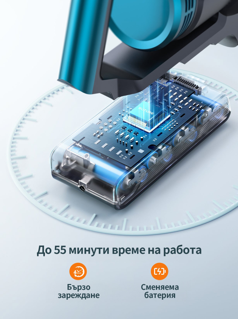 Сменяемата батерия с капацитет 7×2500 mAh предлага до 55 минути почистване в ECO режим – достатъчно за целия ви дом.