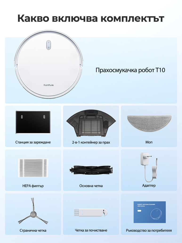 С височина от едва 8,4 см, прахосмукачката робот Honiture T10 е проектирана така, че лесно да преминава под дивани, легла и тесни пространства, достигайки до скрития прах и осигурявайки оптимално почистване в целия дом.