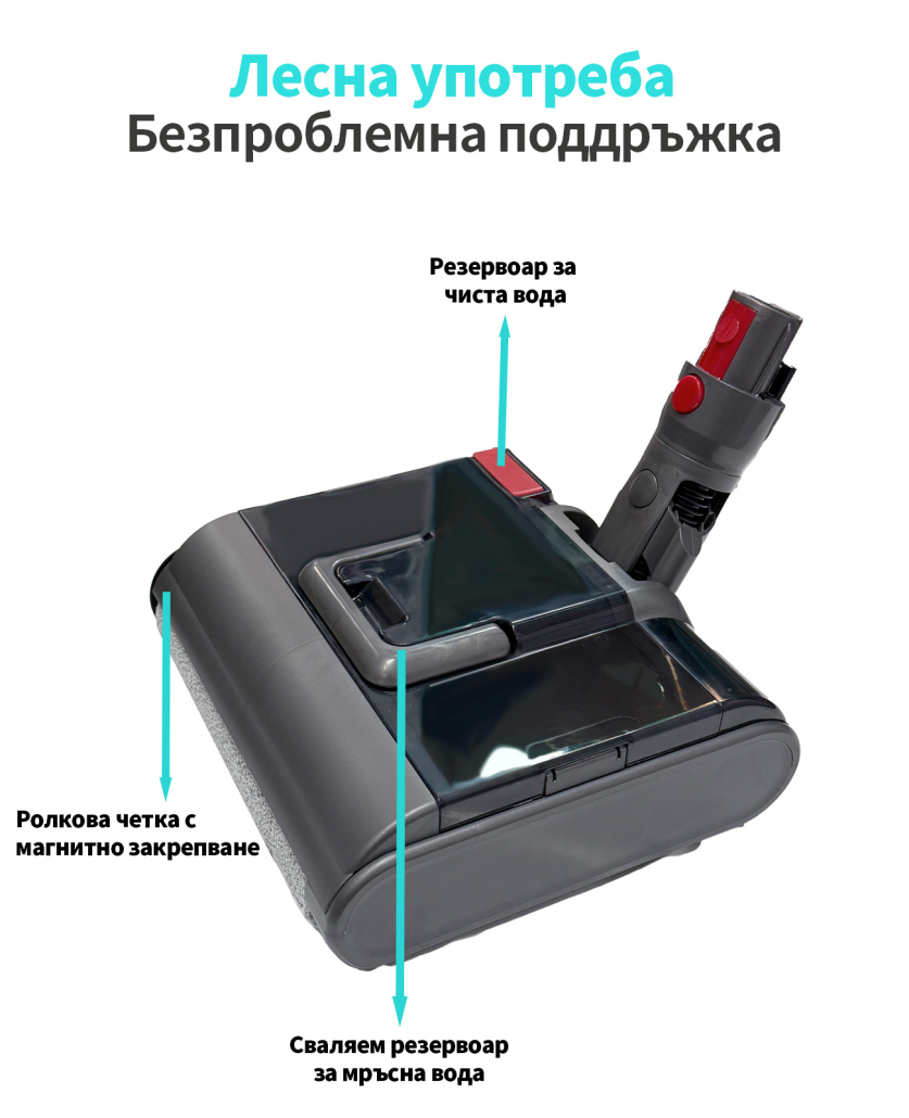 Високоефективният въртящ се моп премахва упорити петна, прах и замърсявания с лекота, а интуитивният дизайн прави приставката лесна за разглобяване и почистване след всяко използване. Подходяща за твърди подови настилки като плочки, паркет и ламинат, тя осигурява безупречно хигиенично почистване без усилие.